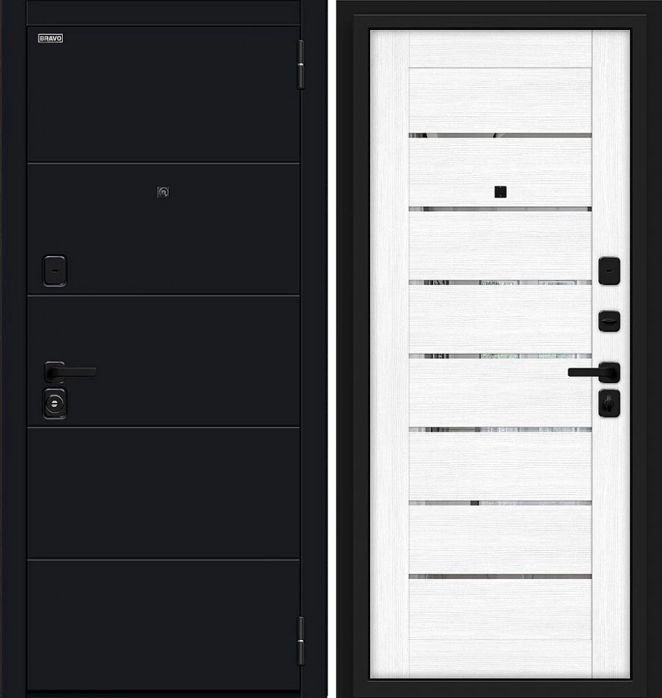 Надежная входная Дверь Браво Прайд Total Black/Snow Melinga премиум класса по цене 39 921 руб. Большая толщина стали защитит от проникновения в ваш дом, квартиру или коттедж. Используется очень качественная фурнитура: замки, цилиндры, ручки, защелки. Покрытие и отделка двери изготовлено под внимательным контролем производителя. Дверь имеет долгий срок службы и гарантию.