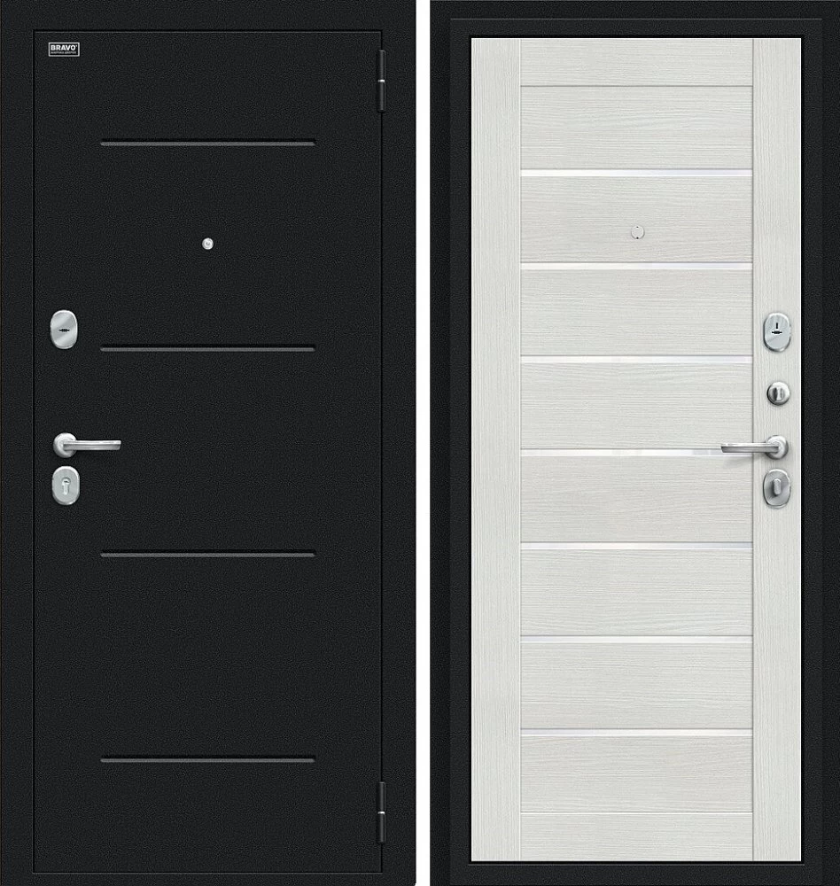 Надежная входная Дверь Браво Техно Букле черное/Bianco Veralinga премиум класса по цене 31 421 руб. Большая толщина стали защитит от проникновения в ваш дом, квартиру или коттедж. Используется очень качественная фурнитура: замки, цилиндры, ручки, защелки. Покрытие и отделка двери изготовлено под внимательным контролем производителя. Дверь имеет долгий срок службы и гарантию.